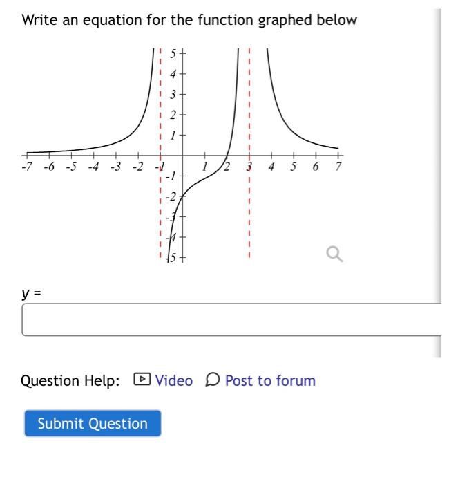 Algebra questions and answers. Write an equation for the function graphed below. X -2 x 4 y the intersection is x 1 x 2 The vertical asymptotes give the denominator.